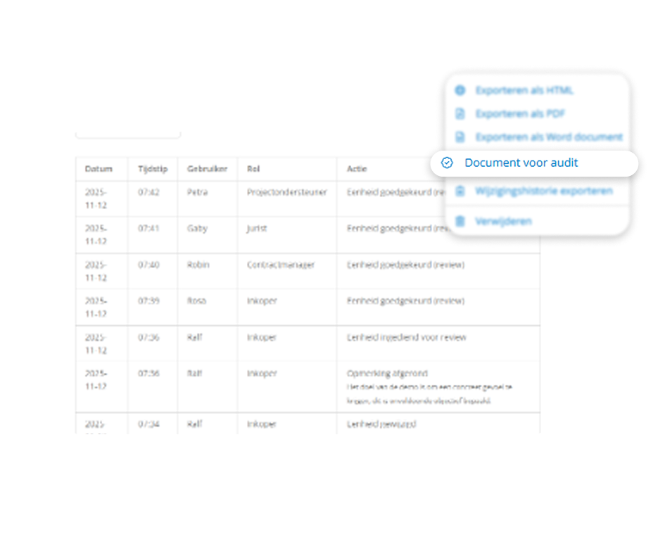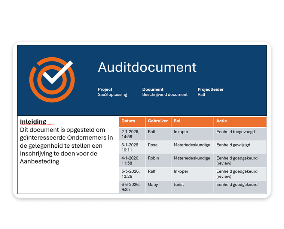 Doordat auditdocumentatie automatisch wordt opgebouwd, hoeft het team zich niet achteraf te verdiepen in wat er is gebeurd. Dit voorkomt stress bij controles en zorgt voor een transparant en goed gedocumenteerd aanbestedingsproces.