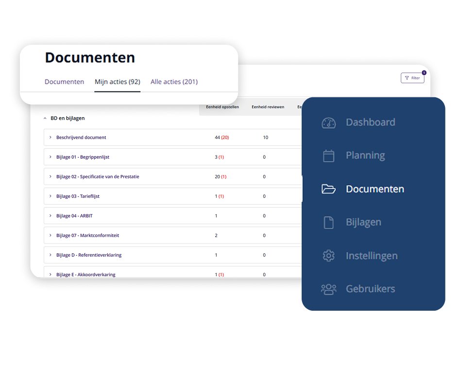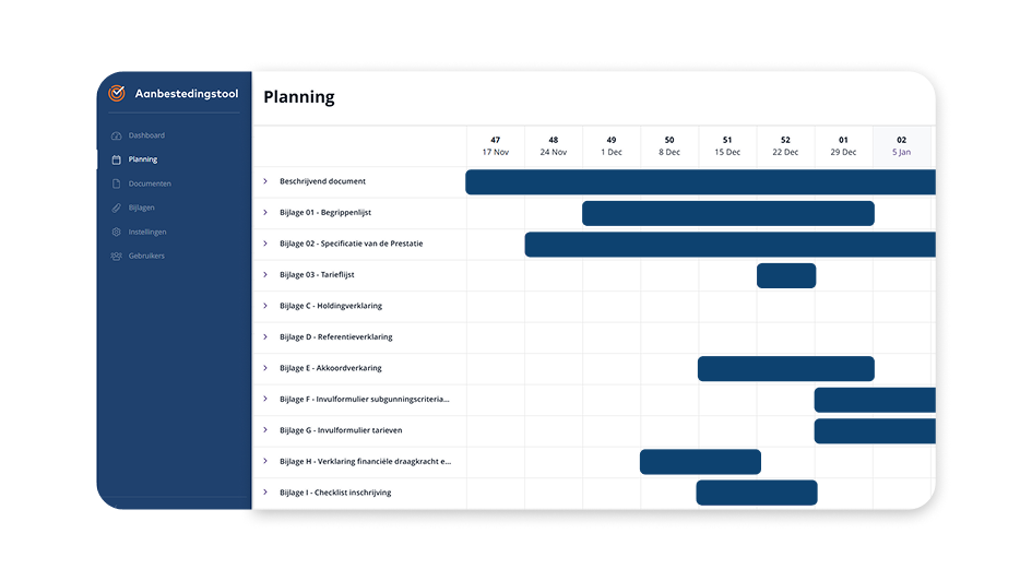 Door duidelijke afspraken, vaste workflows en realtime inzicht verdwijnt onnodige afstemming. Dit geeft rust in het team en zorgt ervoor dat de aandacht weer kan gaan naar de inhoud en kwaliteit van de aanbesteding, in plaats van naar het proces eromheen.