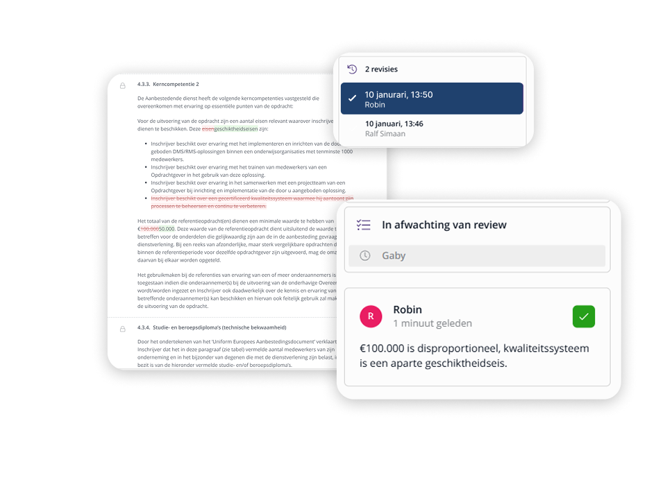 Samenwerken aan aanbestedingen verloopt vaak chaotisch. Documenten circuleren per e-mail, iedereen reviewt alles en het is onduidelijk wie waarvoor verantwoordelijk is. In de Aanbestedingstool stel je vaste workflows in die bepalen wie teksten opstelt, reviewt of goedkeurt. Zo weet iedereen precies wat er verwacht wordt, op het juiste moment.
